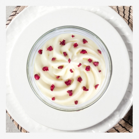 Połączenie cukierniczej pasji i dobrej jakości składników tworzy deser, który rozpieści każde podniebienie. Biała czekolada rozpuszczona w kąpieli wodnej z dodatkiem idealnie ubitej śmietany to klucz do serca każdego miłośnika słodkości. Dodatek musu malinowego nadaje niepowtarzalny owocowy smak całej kompozycji. Lekka i puszysta konsystencja zabierze nas w podniebną podróż rozkoszy.