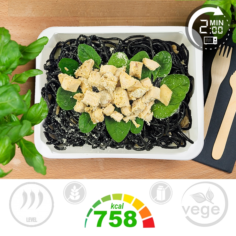 Składniki: Makaron tagliatelle 50,5% (makaron tagliatelle czarny [mąka z PSZENICY durum, sepia (atrament z MĄTWY, sól)] 99,9%, sól 0,1%), Kurczak w glazurze sojowo-miodowej 20,7% (pierś z kurczaka 91,7%, sos SOJOWY jasny (woda, ziarno SOI, sól, ocet spirytusowy) 2,8%, miód 1,5%, papryka wędzona mielona 1%, sok z cytryny 1%, olej rzepakowy 0,8%, sól 0,6%, czosnek 0,5%), Mix warzyw 18,4% (kalafior 35,9%, marchew 31,9%, brokuł 31,9%, sól 0,4%), Aglio olio 9,2% (oliwa z oliwek 78,5%, czosnek 14,9%, natka pietruszki 5%, papryka chili 1%, lubczyk 0,5%, pieprz czarny 0,1%, sól 0,1%), Ser dojrzewający twardy 1,1% (ser dojrzewający twardy tarty (MLEKO, sól, podpuszczka mikrobiologiczna, lizozym z JAJKA) 100%)